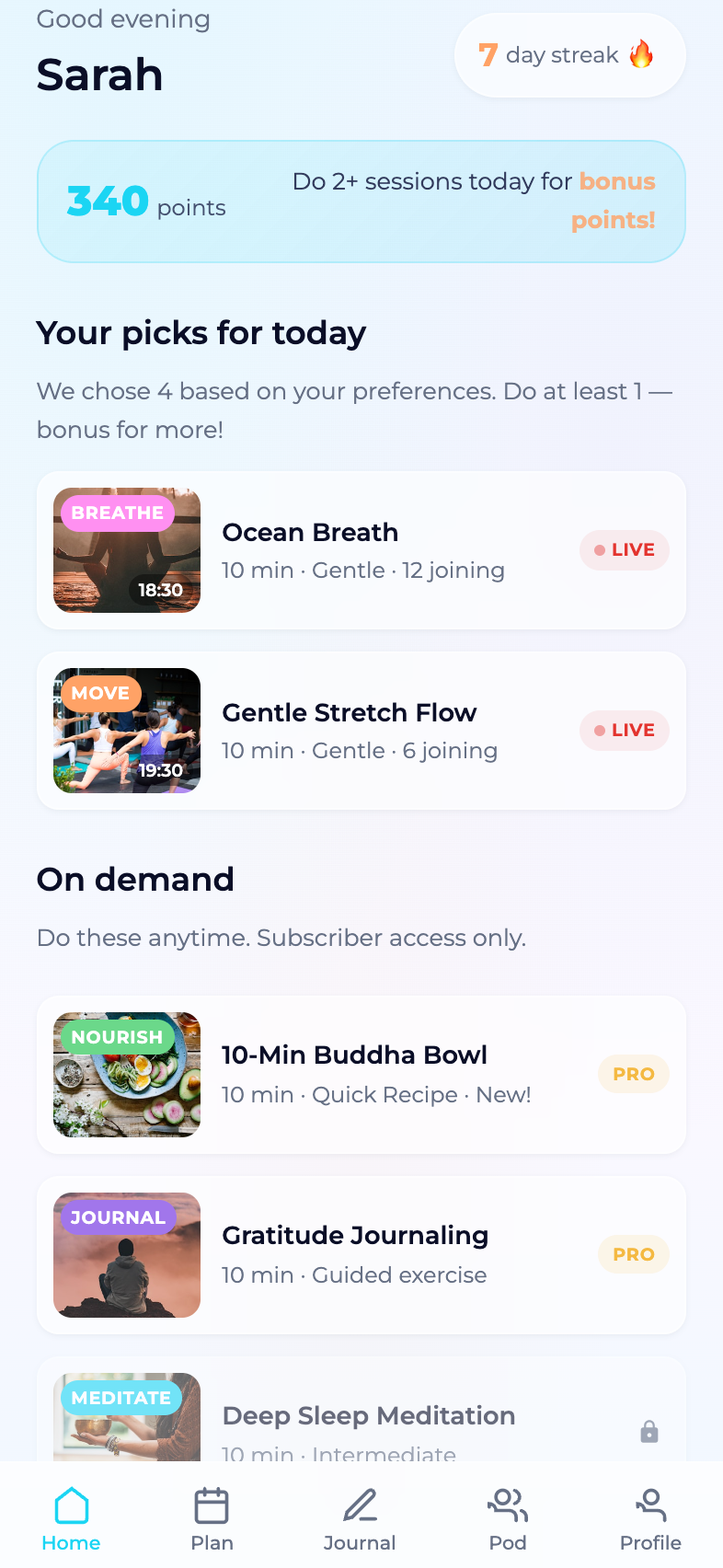 Science-backed micro-wellness sessions — yoga, breathwork, meditation, journaling. Live on the app, every hour, every day. Free.